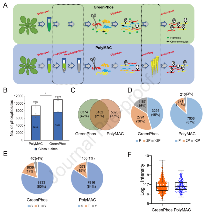 2023年11月27日,中國科學院遺傳與發(fā)育生物學研究所汪迎春團隊在Molecular Plant在線發(fā)表了題為GreenPhos, a universal method for in-depth measurement of plant phosphoproteomes with high quantitative reproducibility?的研究論文。論文中報道了一種具有突破性的植物磷酸化蛋白質(zhì)組學新技術。該技術采用了簡化、穩(wěn)健的工作流程,有效地克服了植物磷酸化蛋白質(zhì)組分析的主要技術難點,能高靈敏度、高特異性快速地富集植物磷酸肽。利用該技術可定量分析不同植物的磷酸蛋白質(zhì)組,其分析深度之深、定量重復性之高前所未有,有望成為植物磷酸蛋白組學的通用技術。由于該技術主要面向高等植物及其它綠色生物(如衣藻),且操作簡便,極大地降低了實驗所需的人力和試劑費用,因此命名為GreenPhos (綠磷)。