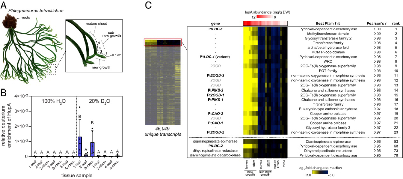 為了指導對石松生物堿生物合成的研究,作者重點關注 HupA,因為它已知具有作為 AChE 抑制劑的活性和作為藥物的潛力。HupA 由石松屬內(nèi)的物種產(chǎn)生,但這些物種的 HupA 積累水平差異很大。作者推斷物種中 HupA 的增加可能與上調(diào)的生物合成基因表達有關。因此,檢測了石松屬的幾個物種的 HupA 含量,結果發(fā)現(xiàn)P. tetrastichus(圖 2A)積累了 HupA 到最高水平。因此,后續(xù)的研究將集中在該物種上。之前的研究表明,從頭 HupA 生物合成對P. tetrastichus枝條的新生長具有特異性,接著作者通過氘同位素標記實驗得到驗證,并且發(fā)現(xiàn)與莖相比,HupA標記在葉中更廣泛分布,表明這里的生物合成基因表達富集(圖2B)。因此,作者對對該物種的多個組織進行了RNA-seq分析,揭示石杉生物堿生物合成基因在活性組織中的積累機制。
