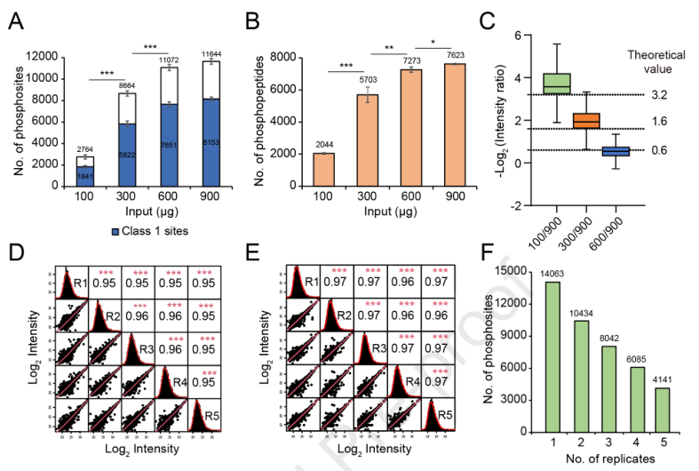 為了評估GreenPhos在定量磷酸化蛋白質(zhì)組學中的潛力,作者了鑒定的磷酸化肽與上機量之間的定量關系。以900μg為參照,在100、300和600μg中,檢測到的磷酸肽強度比與參考中磷酸肽強度比的中位數(shù)與理論值具有很好的相關性(圖3C)。分析結果表明,GreenPhos與單次LC-MS結合可用于從高達600μg的蛋白質(zhì)中定量磷酸肽,準確度高。通過5次重復質(zhì)譜分析,評價了GreenPhos在植物磷蛋白組定量鑒定中的再現(xiàn)性。5個生物重復和5個技術重復的磷酸肽強度的Pearson相關系數(shù)平均分別為0.95和0.97 (圖3D和3E),表明具有較高的定量可重復性。從5個生物重復中共鑒定出磷酸化位點14063個,其中74%的磷酸化位點至少在2個重復中鑒定出 (圖3F)。結果表明,GreenPhos可以在定量和定性上產(chǎn)生高度可重復性的結果。