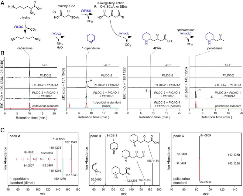 接下來,推測通過向 1-哌啶聚合物中添加丙二酰輔酶 A 衍生的聚酮鏈以產(chǎn)生 4-(2-哌啶基)乙酰乙酸(4PAA),該酸可以脫羧產(chǎn)生peletierine(圖 1B)。聚酮底物的產(chǎn)生表明聚酮合酶(PKS)酶參與催化這種亞胺-酮縮合反應,并在石松生物堿的生物合成中起作用。進一步分析揭示了兩個PKS候選基因(PtPIKS-1和PtPIKS-2),與PtLDC-1共表達基因之一(圖2C)。PtPIKS-1 PtPIKS-2與PtLDC-2 和PtCAO-1在煙草葉片中的瞬時共表達導致1-哌啶代謝物的消耗和幾種新化合物的產(chǎn)生。其中一種化合物具有與假定的石松生物堿前體peletierine相對應的精確質(zhì)量數(shù) ([M+H]=m/z