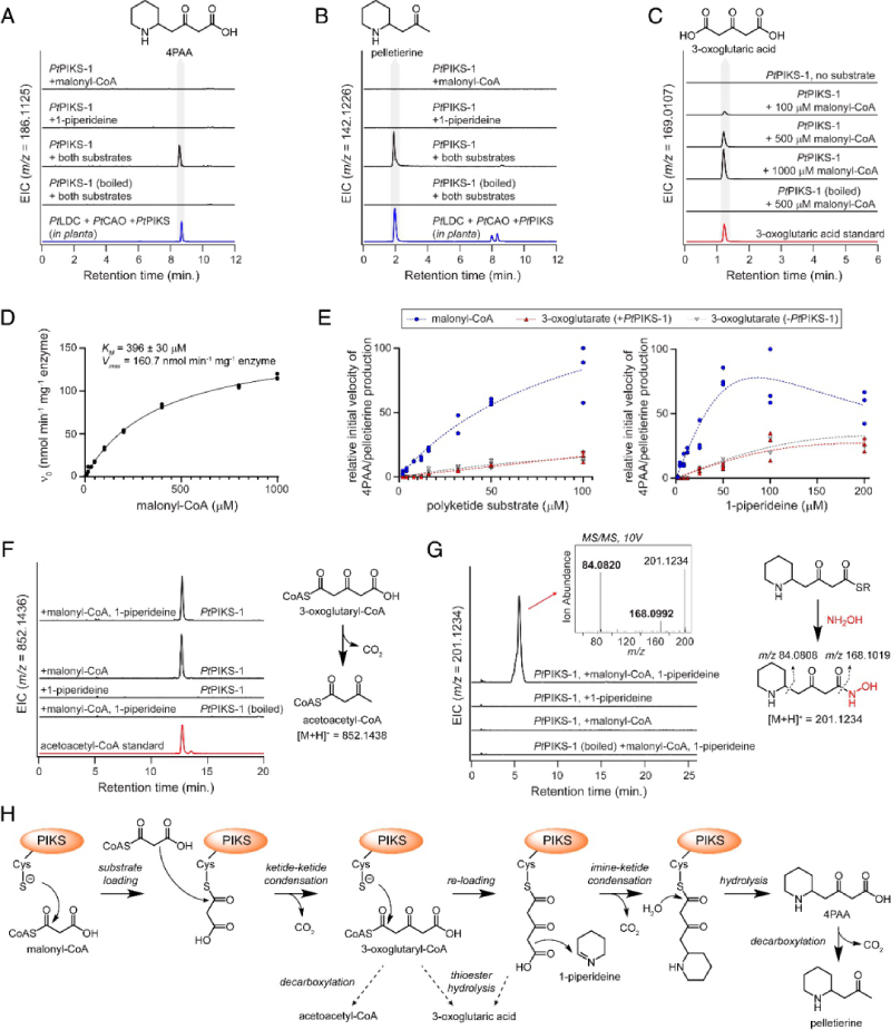 為了更好地了解這種亞胺-酮縮合的機制,獲得了兩種PtPIKS同源基因的純化蛋白用于體外分析。與我們在本式煙草中的結果一致,當添加 1-哌啶和丙二酰輔酶 A 作為底物時,PtPIKS-1和PtPIKS-2在體外測定中都產(chǎn)生了4PAA和pelletierine(圖4 A和B),此外還有其他幾種未知化合物。雖然當單獨孵育 1-哌啶作為底物時沒有觀察到明顯的產(chǎn)物,但僅向PtPIKS-1添加丙二酰輔酶 A 會導致 3-氧代戊二酸的積累(圖 4 C 和 D)。3-氧代戊二酸的積累表明,PIKS能夠催化兩個丙二酰輔酶A單元縮合成硫酯連接的3-氧代谷氨?;鶊F,并且該聚酮酸從硫酯鍵上酶促或非酶水解。
