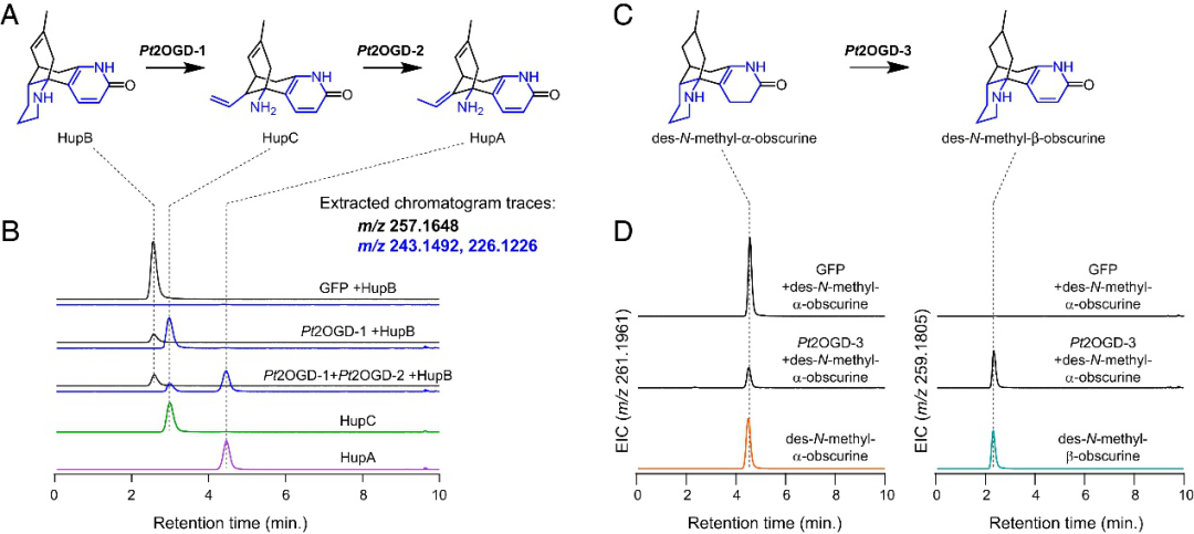 為進一步研究其他下游生物合成途徑。特別是,兩種石松生物堿,des-N-methyl-α-obscurine(DNMAO)和des-N-methyl-β-obscurine(DNMBO),與HupB共享相同的碳骨架,可能是HupB的前體(圖 5)。因此作者通過與上述已知基因的高共表達分析及體外酶活驗證實驗發(fā)現(xiàn)另一種獨特的2OGD酶(Pt2OGD-3)能將DNMAO轉(zhuǎn)化為DNMBO(圖5),從而形成最終在HupA中發(fā)現(xiàn)的吡啶酮環(huán)。并且發(fā)現(xiàn)Pt2OGD-1和Pt2OGD-2可以依次作用于DNMBO,以產(chǎn)生假定的HupC和HupA的8,15-二氫同系物。Pt2OGD-1不作用 DNMAO,表明在DNMBO和HupB中發(fā)現(xiàn)的吡啶酮環(huán)的存在對Pt2OGD-1底物結合和/或催化活性至關重要,但是參與其中的去飽和酶尚未被發(fā)現(xiàn)。