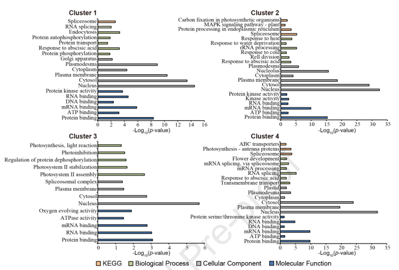 使用Fisher’s-exact對每個簇中的磷酸化蛋白進行GO和KEGG富集分析(圖5)。與報道一致,在細胞組分條目,細胞核、細胞質(zhì)和細胞膜蛋白在所有簇中被顯著富集。在分子功能條目,激酶活性在簇1、2和4中富集,而在簇3中不富集,但是蛋白質(zhì)去磷酸化的在生物過程條目在簇3中富集。結果表明,激酶的磷酸化激活和磷酸酶的去磷酸化是鹽脅迫誘導的重要反應。