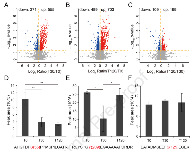為了深入了解擬南芥對鹽脅迫響應中蛋白磷酸化介導的信號,作者使用GreenPhos和單次LC-MS檢測,分析了100 mM NaCl處理30分鐘(T30)和120分鐘(T120)或未處理(T0)的擬南芥幼苗的磷酸化蛋白質(zhì)組學(圖4A)。每個處理包括3個生物學重復,每個重復600μg蛋白用于磷酸肽的富集。總共從4316個磷酸化蛋白中鑒定出12908個磷酸肽,含有15889個磷酸化位點。在磷酸肽中,13473個磷酸位點在處理的至少一個重復中包含可量化的信息。
