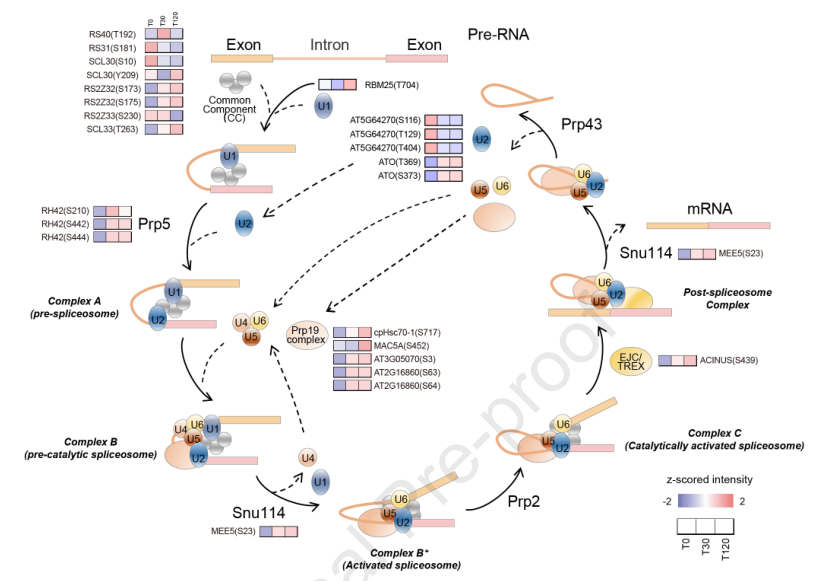 除了激酶外,在簇1、2和4中剪接體被KEGG通路顯著富集 (圖5),暗示磷酸化調(diào)控mRNA的可變剪接,是植物響應脅迫的關鍵過程。在鹽脅迫下,18個剪接體蛋白上共有28個不同的位點被差異磷酸化 (圖7)。利用PRM進一步驗證了Y209在SCL30上的差異磷酸化(圖6)。據(jù)報道,RNA解旋酶及其磷酸化對剪接體的組裝至關重要。在鹽脅迫30分鐘后,Prp5的S210、S442和S444位點磷酸化增加,并在120分鐘后保持高水平,Prp19的多個亞基也觀察到類似的磷酸化模式(圖7)。盡管這些差異磷酸化事件的意義尚未得到明確的證明,但它們可能參與了鹽脅迫誘導的mRNA剪接的調(diào)控。