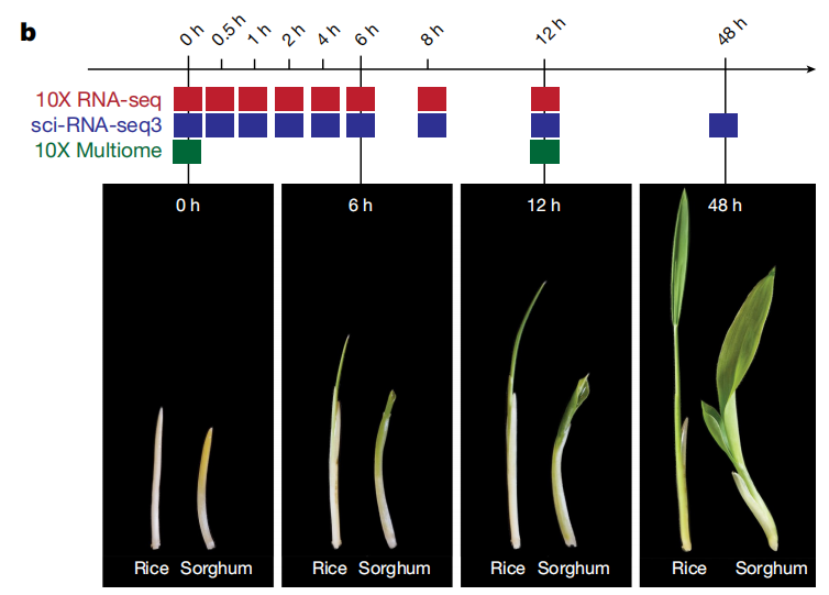 單細(xì)胞核轉(zhuǎn)錄組:水稻和高粱幼苗暗生長5天后,在光周期(12h光/12h暗)中采集0h(暗)、0.5h、1h、2h、4h、6h、8h、12h、48h共9個(gè)時(shí)間點(diǎn)的地上組織??傆?jì)水稻190,569個(gè)核、高粱265,701個(gè)核。