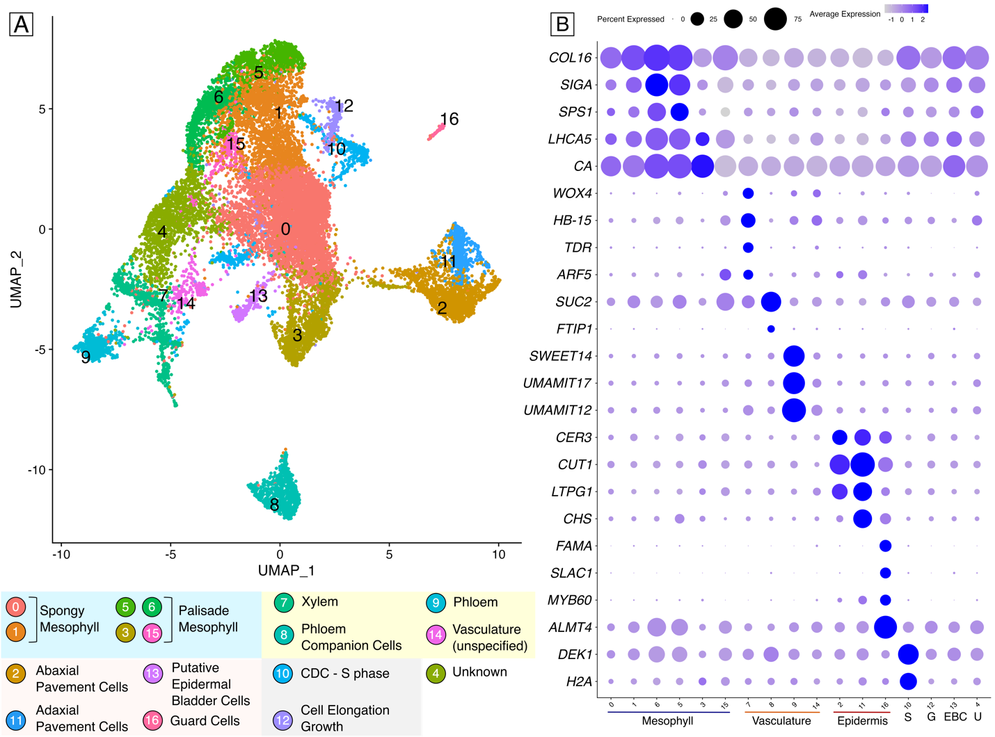 單細(xì)胞核測序:共獲取17,994個(gè)高質(zhì)量核,注釋17個(gè)細(xì)胞簇,覆蓋葉肉(海綿/柵欄)、表皮、保衛(wèi)細(xì)胞、木質(zhì)部、韌皮部等