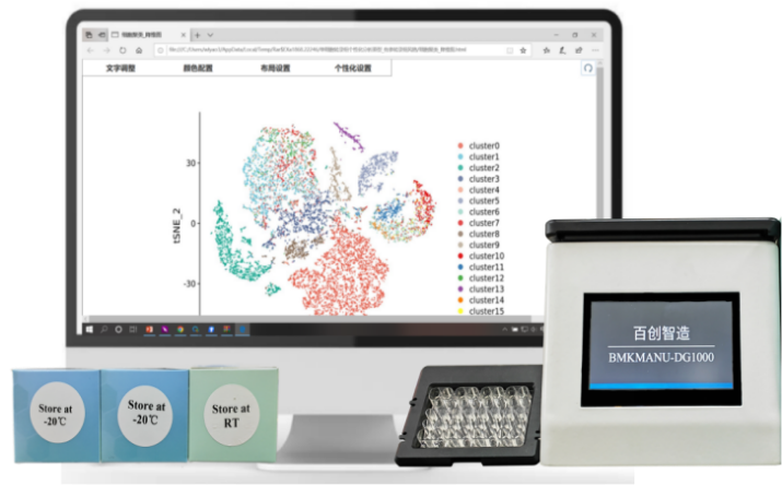 為了突破單細胞試劑耗材及儀器長期以來的國外技術(shù)壟斷,降低單細胞應(yīng)用的成本,讓單細胞技術(shù)能夠惠及更多的科研群體,經(jīng)過多年潛心研發(fā),百創(chuàng)智造發(fā)布自主研發(fā)的極速單細胞微液滴系統(tǒng)-百創(chuàng)DG1000。百創(chuàng)DG1000是基于微流控、油滴包裹和Barcode標記等技術(shù)來實現(xiàn)高通量的細胞捕獲。除了儀器以外,百創(chuàng)DG1000還有配套的2×4的獨立芯片及配套試劑盒(圖4)。