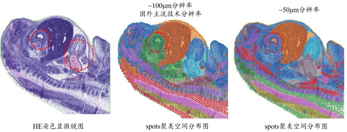 大鼠胚胎亞細胞分辨率實測數(shù)據(jù)展示:與100μm分辨率(主流技術(shù)平臺)對比,高分辨率(~50μm)下HE染色組織形態(tài)學(xué)與spots聚類空間分布圖重合度更高,精準識別空間基因表達的異質(zhì)性和組織區(qū)域的特異性(圖7)。