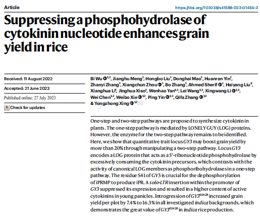 作者通過(guò)秈稻品種特青和粳稻品種02428構(gòu)建高級(jí)遺傳群體克隆了產(chǎn)量相關(guān)基因GY3,其啟動(dòng)子區(qū)域的反轉(zhuǎn)座子插入增強(qiáng)了啟動(dòng)子區(qū)域的表觀修飾,降低GY3表達(dá)量,從而減少細(xì)胞分裂素合成前體底物的無(wú)效消耗,提高體內(nèi)活性的細(xì)胞分裂素含量,增加每穗粒數(shù)和谷物產(chǎn)量。GY3可作為后期秈稻高產(chǎn)育種的重要目標(biāo)基因,推動(dòng)產(chǎn)量提升。