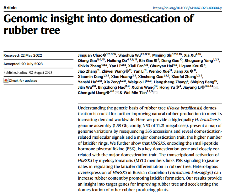 作者利用PacBio CLR+BioNano+Hi-C的方法構(gòu)建了橡膠樹(shù)參考基因組,結(jié)合127個(gè)栽培和208個(gè)野生品種重測(cè)序數(shù)據(jù)對(duì)其馴化的分子機(jī)制解析,同時(shí)通過(guò)208份橡膠樹(shù)種質(zhì)材料進(jìn)行GWAS分析,鑒定到一個(gè)調(diào)控乳管數(shù)量的馴化基因。此研究將為后期橡膠樹(shù)的高產(chǎn)育種提供了分子基礎(chǔ)。