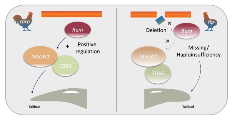 通過(guò)對(duì)包含家系內(nèi)特殊基因型個(gè)體的突變位點(diǎn)進(jìn)行綜合篩選和分析后,一個(gè)4.2 kb的缺失被確定與瓢雞的無(wú)尾表型完全相關(guān)。在對(duì)致因區(qū)間內(nèi)的基因表達(dá)結(jié)果進(jìn)行深入探究后,一個(gè)全新的基因Rum(長(zhǎng)度大于22 kb,無(wú)內(nèi)含子),其表達(dá)呈現(xiàn)出無(wú)尾表達(dá)缺失,雜合子是顯性純合子表達(dá)量的一半的現(xiàn)象。深入研究發(fā)現(xiàn)Rum的表達(dá)具有胚胎特異性,研究人員認(rèn)為Rum的表達(dá)缺失以及雜合子中的單倍劑量不足,使其無(wú)法正常調(diào)控MSGN1基因長(zhǎng)轉(zhuǎn)錄本以及TBX6等基因的正常表達(dá),進(jìn)而使得尾部骨骼發(fā)育出現(xiàn)異常。
