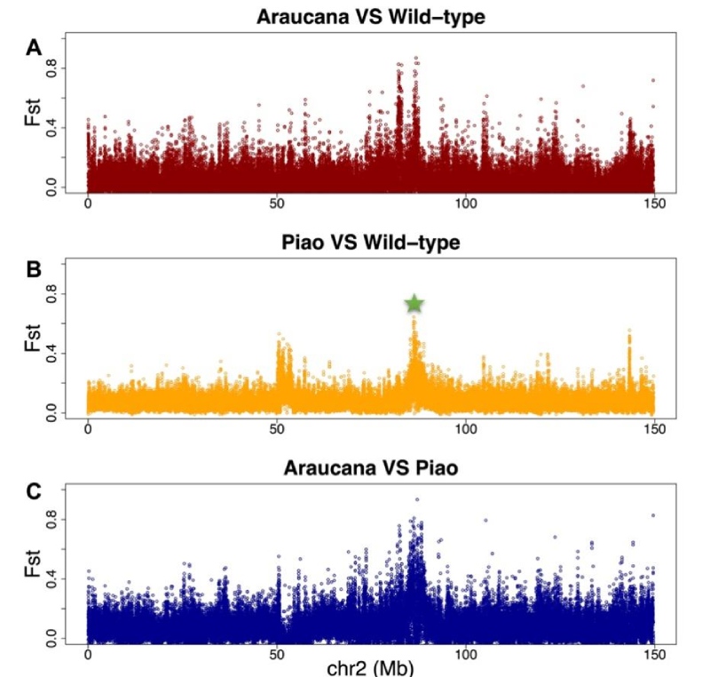 瓢雞無(wú)尾表型的定位區(qū)間,與之前報(bào)道的美國(guó)阿勞卡納雞品種無(wú)尾表型區(qū)間非常接近但精細(xì)定位區(qū)間沒(méi)有重疊。對(duì)瓢雞、阿勞卡納以及其他具有正常尾巴的多個(gè)種群的群體基因組分析顯示,雖然這兩個(gè)無(wú)尾品種在2號(hào)染色體的相同區(qū)域受到選擇,但選擇具有品種差異性。在阿勞卡納雞2號(hào)染色體上識(shí)別的兩個(gè)候選SNP在無(wú)尾瓢雞中并不存在,并且在瓢雞中證實(shí)的致因缺失突變?cè)诎诳{雞也不存在。即瓢雞和阿勞卡納雞無(wú)尾特征可能源自不同的致病突變。