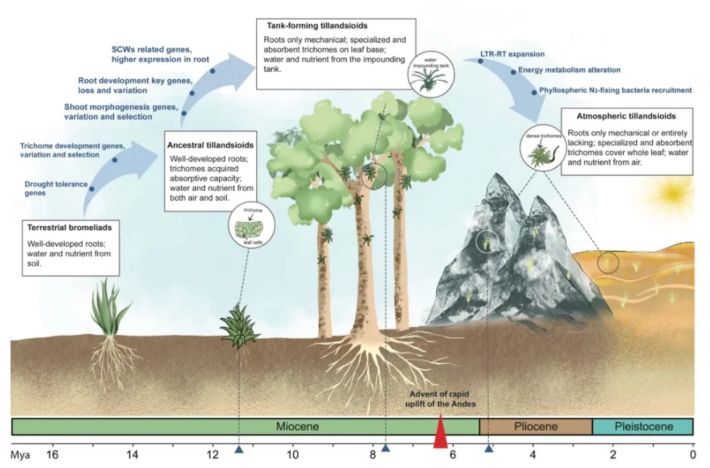 為了追溯空氣鳳梨的起源,研究人員廣泛收集了覆蓋空氣鳳梨亞科(Tillandsioideae)78%屬的植物,利用轉(zhuǎn)錄組測序獲得低拷貝基因的91個核基因,構(gòu)建了空氣鳳梨亞科植物系統(tǒng)發(fā)育樹(圖1)。然后通過祖先重建和分子鐘計算,發(fā)現(xiàn)核心空氣鳳梨亞科植物起源于11.3百萬年前的安第斯山脈,祖先類型為積水型鳳梨(圖2a)。大約在6百萬年前,安第斯山脈快速隆起,推動了物種的分化,完全大氣生的空氣鳳梨出現(xiàn),這些植物通常被稱為“air plants”。地球氣候世代的轉(zhuǎn)變也加速了物種的分化(圖2b-c)。