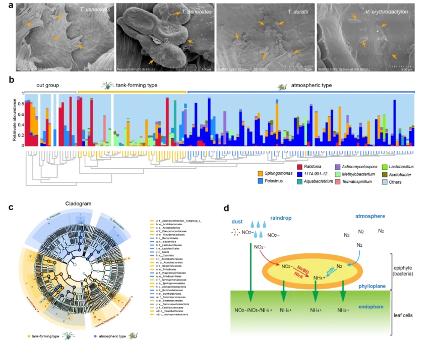 在解決了水分吸收問題后,另一個對空氣植物生存至關(guān)重要的問題是養(yǎng)分問題。研究人員通過16S rRNA測序和宏基因組分析,發(fā)現(xiàn)空氣鳳梨葉表附生了大量固氮細(xì)菌(圖7a),且這些細(xì)菌具有特異性,特別是1174-901-12屬細(xì)菌,專一性地附生在空氣鳳梨的葉表,并且在細(xì)菌類群中占據(jù)主要地位,可能與空氣鳳梨共進(jìn)化(圖7b-c)。此外,固氮酶nifA和nifH的發(fā)現(xiàn)進(jìn)一步證實(shí)了這些細(xì)菌的固氮能力(圖7d)。這些固氮細(xì)菌可能成為空氣植物的主要氮源,尤其在營養(yǎng)匱乏的空中環(huán)境中尤為重要。