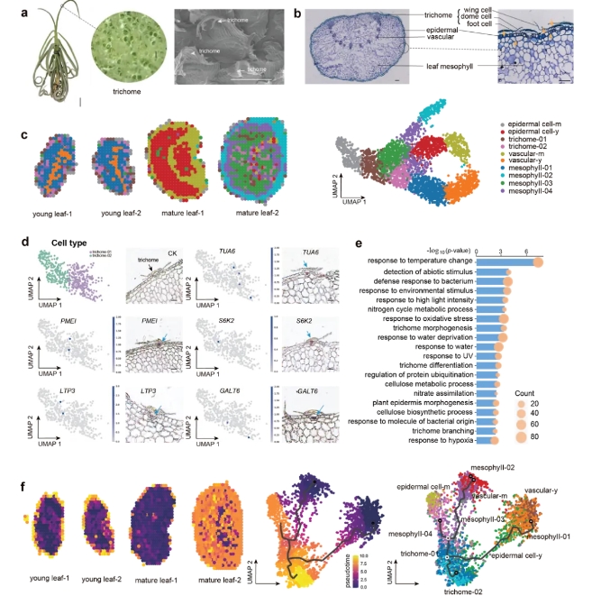隨著根部失去吸收水分和養(yǎng)分的能力,附生鳳梨科植物的葉片表皮中特化的表皮毛進(jìn)化出了吸收功能,代替根系,實(shí)現(xiàn)了“器官功能互補(bǔ)”。這些多細(xì)胞表皮毛由基部活細(xì)胞和死盾形部分組成,表面覆蓋薄層角質(zhì)層,能夠阻止毛細(xì)管流動,這對其吸收功能至關(guān)重要。研究人員通過大規(guī)模比較基因組分析鑒定出與角質(zhì)合成相關(guān)的三個關(guān)鍵串聯(lián)重復(fù)基因——CYP96A15(圖5a)。這三個基因在所有附生鳳梨植物中經(jīng)歷序列變異后被選擇并固定(圖5b)。在原位雜交實(shí)驗(yàn)中,發(fā)現(xiàn)這些CYP96A15重復(fù)基因在表皮毛的頂端和基部細(xì)胞中特異性表達(dá)(圖5c),進(jìn)一步表明它們可能在空氣鳳梨表皮毛吸收功能的獲得中發(fā)揮了關(guān)鍵作用。此外,研究人員還通過空間轉(zhuǎn)錄組技術(shù),鑒定出多個在表皮毛細(xì)胞中特異性表達(dá)的基因,為后續(xù)空氣鳳梨表皮毛的研究提供了新的突破口(圖6)。