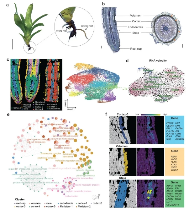 空氣鳳梨的根部功能顯著退化,主要僅發(fā)揮機(jī)械“固著”作用或完全缺失。通過基因組和比較基因組分析(圖3a-e),研究人員發(fā)現(xiàn)與根發(fā)育相關(guān)的關(guān)鍵基因(如SCR、WER、TTG1、JKD)在附生鳳梨類群中發(fā)生了快速進(jìn)化,并受到選擇固定(圖3i-j)。與側(cè)根發(fā)育相關(guān)的AR1基因家族則出現(xiàn)顯著收縮。與根系響應(yīng)重力的關(guān)鍵基因ARG1丟失,而負(fù)調(diào)控基因WG2則受到正向選擇。同時,根系對水分響應(yīng)的關(guān)鍵基因EN1也發(fā)生喪失。這些結(jié)果表明,空氣植物的進(jìn)化適應(yīng)增強(qiáng)了它們在大氣生態(tài)位中的生存能力。此外,利用相同的方法,研究人員還找到了空氣鳳梨耐旱的基因組適應(yīng)性進(jìn)化的關(guān)鍵基因(圖3f-g)和積水類型鳳梨蓄水槽形成的關(guān)鍵基因AS1的變異選擇(圖3h)。此外,研究人員通過空間轉(zhuǎn)錄組分析發(fā)現(xiàn),與次生細(xì)胞壁合成相關(guān)的多個基因在根被和皮層組織中表現(xiàn)出快速表達(dá),為根系在生長過程中迅速木質(zhì)化并發(fā)揮機(jī)械“固著”作用提供了分子基礎(chǔ)(圖4)。