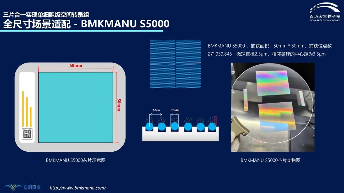 隨著百邁客生物在時空組學(xué)領(lǐng)域的不斷探索,在保證具備亞細(xì)胞分辨率的條件下,研究團(tuán)隊(duì)已成功完成了全尺寸場景適配捕獲芯片BMKMANU S5000的研發(fā)與測試。捕獲面積:50mm*60mm;捕獲位點(diǎn)數(shù):271,939,845;微球直徑:2.5μm;相鄰微球的中心距為3.5μm。該產(chǎn)品的推出大大降低了空間轉(zhuǎn)錄組實(shí)驗(yàn)對樣本尺寸的限制,將更大程度地滿足當(dāng)前科研需求。
