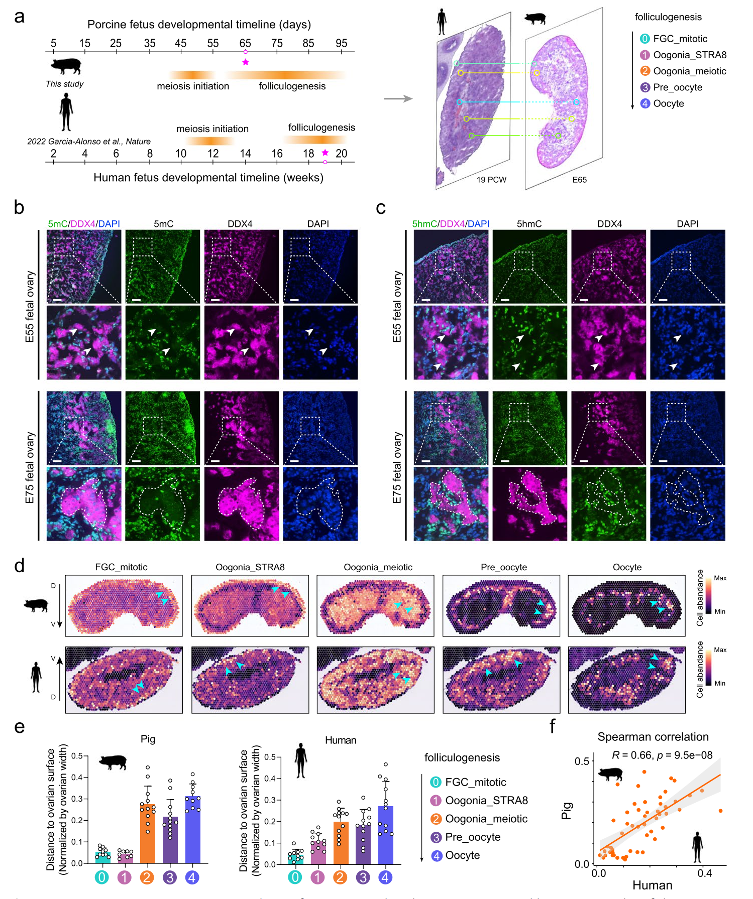 ① 該研究結(jié)合單細(xì)胞RNA測序(scRNA-seq)和空間轉(zhuǎn)錄組學(xué)(ST)來理解時空基因表達(dá)譜,并探索在豬卵子發(fā)生早期卵巢微環(huán)境的空間組織。將卵子發(fā)生不同階段的生殖細(xì)胞簇投射到空間圖譜中,揭示了發(fā)育中的豬卵巢中生殖細(xì)胞的“皮質(zhì)-髓質(zhì)(C-M)”分布。豬和人之間的跨物種分析揭示了在卵子發(fā)生過程中生殖細(xì)胞的保守的C-M分布模式,突出了豬可以作為人類早期卵子發(fā)生過程的理想模型。