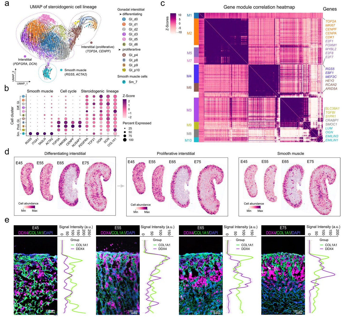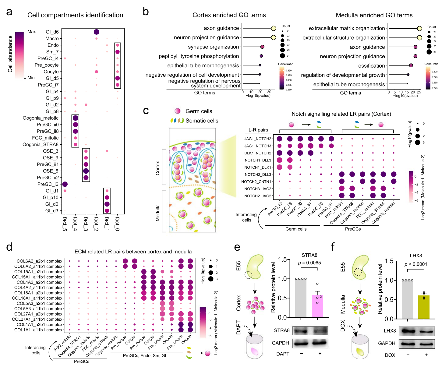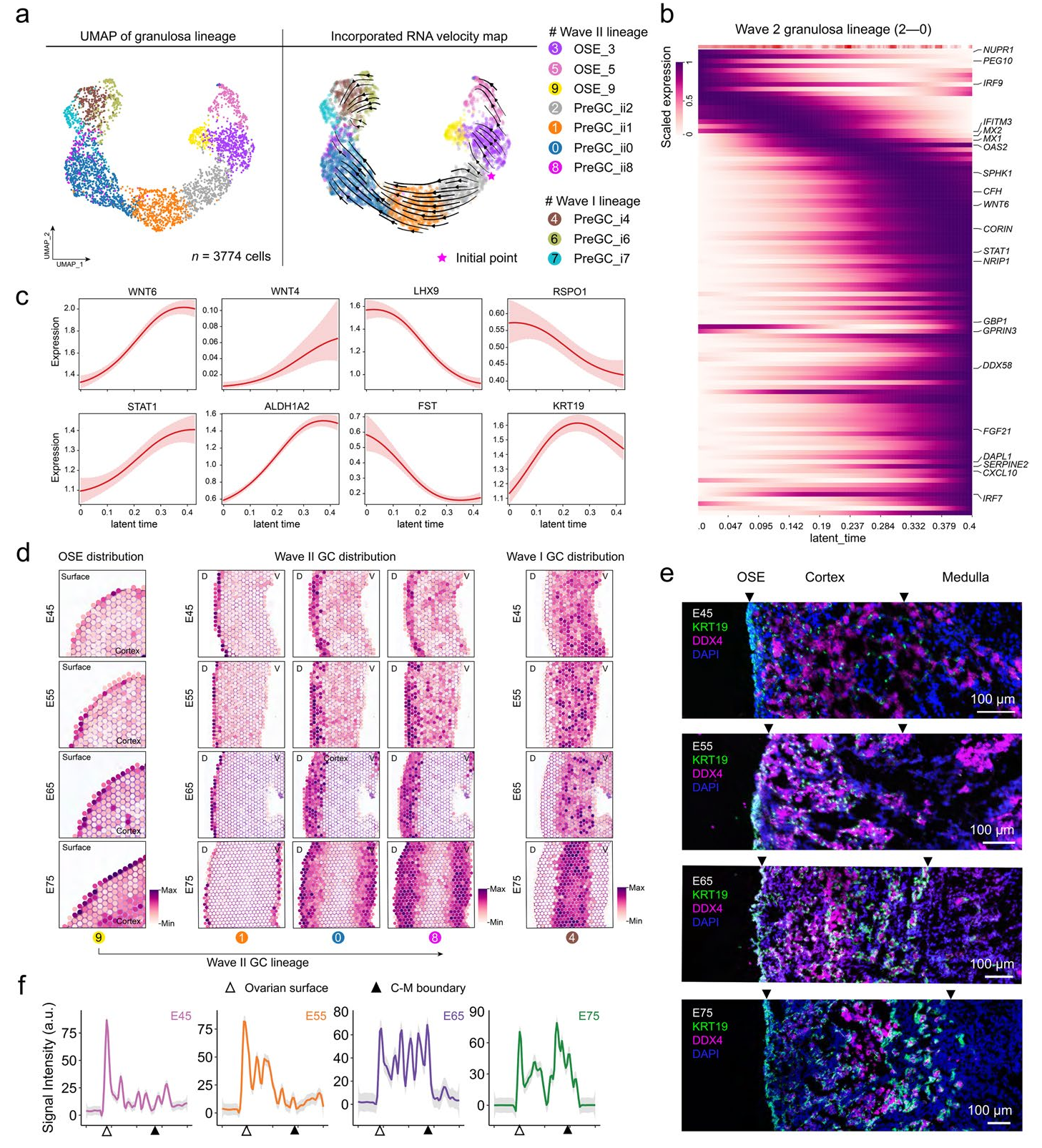 ② 利用ST進(jìn)行RNA速度分析,確定了豬卵巢皮質(zhì)和髓質(zhì)區(qū)顆粒細(xì)胞系的分子特征和空間動力學(xué)??臻g共定位分析和細(xì)胞間通訊分析揭示了皮質(zhì)和髓質(zhì)區(qū)域生殖細(xì)胞和體細(xì)胞之間獨(dú)特的細(xì)胞-細(xì)胞通訊模式。
