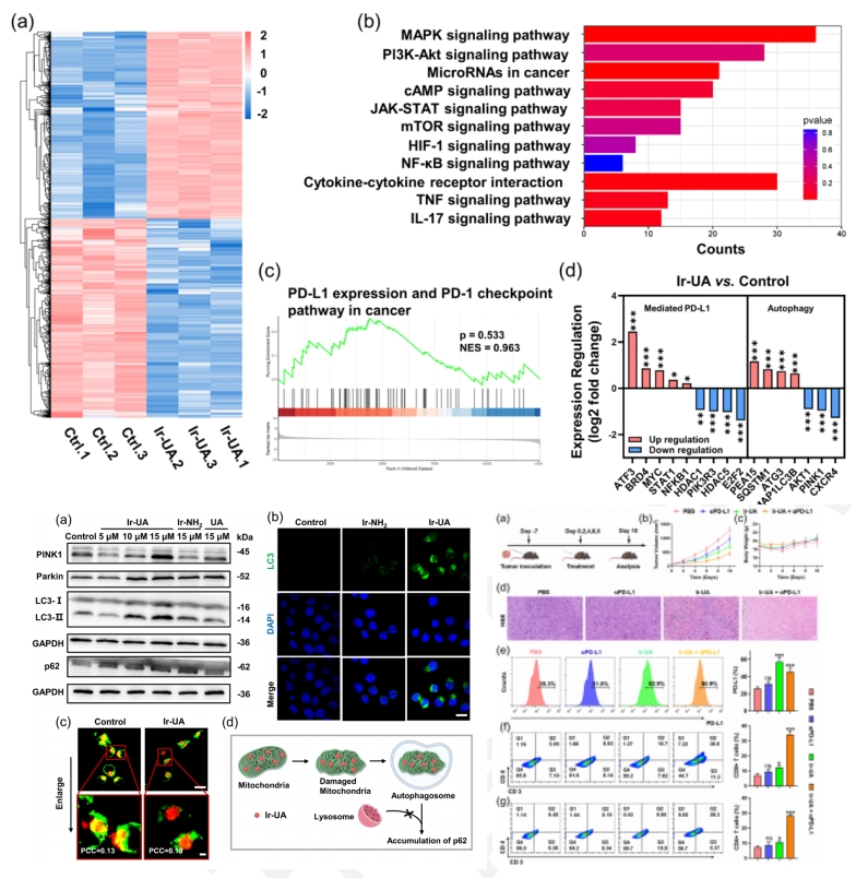 為了證明Ir-UA對PD-L1表達(dá)的強(qiáng)大調(diào)節(jié)能力,研究團(tuán)隊進(jìn)行了轉(zhuǎn)錄組分析,并比較了Ir-UA處理前后的基因表達(dá)情況,KEGG分析結(jié)果表明,癌癥進(jìn)展的各種途徑顯著變化。例如,在Ir-UA處理后觀察到與PD-L1表達(dá)高度相關(guān)的信號通路,如磷脂酰肌醇3-激酶(PI3K)-AKT信號通路、Janus激酶/信號傳感器和轉(zhuǎn)錄激活因子(JAKSTAT)信號通路、絲裂原活化蛋白激酶(MAPK)信號通路等。此外,還檢測到控制先天或適應(yīng)性免疫細(xì)胞的信號通路,如核因子-κB(NF-κB)信號通路、細(xì)胞因子?細(xì)胞因子受體相互作用,白細(xì)胞介素17(IL-17)信號通路,腫瘤壞死因子信號通路等,它們對從“冷腫瘤”向“熱腫瘤”的轉(zhuǎn)變和克服αPD-L1耐藥性起到了重要作用。GSEA結(jié)果顯示吞噬小體和OXPHOS顯著富集,提示Ir-UA可能觸發(fā)自噬小體的形成并抑制OXPHOS。值得注意的是,包括ATF3在內(nèi),癌癥中的PD-L1的表達(dá)和PD-1檢查點(diǎn)通路也顯著富集,這些結(jié)果證實了IrUA增強(qiáng)了PD-L1相關(guān)基因的轉(zhuǎn)錄。細(xì)胞毒性評估結(jié)果顯示,與A549細(xì)胞相比,Ir-UA對正常HLF細(xì)胞的半抑制濃度高了5倍,據(jù)推測,利用PD-L1作為治療靶點(diǎn),可能通過選擇性地調(diào)節(jié)TME中的免疫反應(yīng)來降低毒性。與Ir-NH2相比較,Ir-UA的親脂性以及A549細(xì)胞線粒體中的積累量均有明顯提升,進(jìn)一步證實了Ir-UA具有較強(qiáng)的線粒體靶向能力。