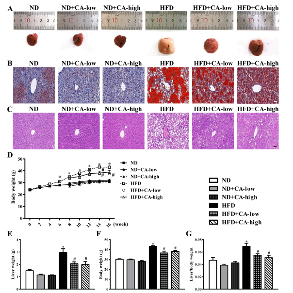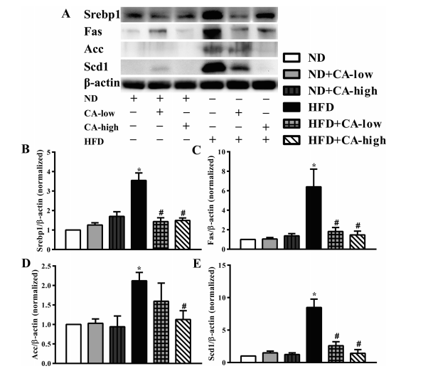 1.補(bǔ)充CA可降低高脂喂養(yǎng)小鼠的脂質(zhì)積累