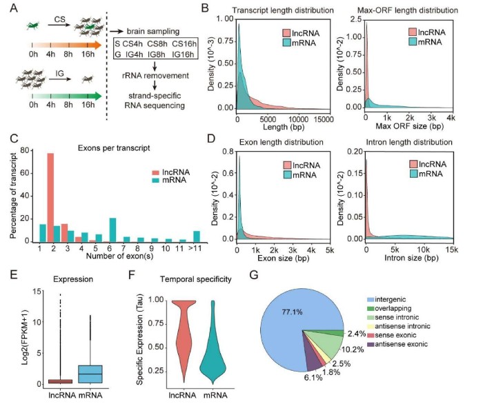 為了進(jìn)一步分析lncRNA和mRNA的表達(dá)模式,使用了短時(shí)間序列表達(dá)挖掘器(ShortTime-seriesExpressionMiner,STEM)對基于表達(dá)的轉(zhuǎn)錄本進(jìn)行聚類。在CS期間,將214個(gè)lncRNA和242個(gè)mRNA分別分為8個(gè)和9個(gè)重要的表達(dá)譜(圖3D)。其中l(wèi)ncRNA表達(dá)譜15以及mRNA表達(dá)譜15、13和16直到群居化處理后8或16小時(shí)才改變。這些配置文件稱為后期更改的配置文件(模式d)。與后期更改的配置文件相反,早期更改的配置文件以4小時(shí)時(shí)間點(diǎn)開始的轉(zhuǎn)錄表達(dá)變化為特征。根據(jù)4小時(shí)后的表達(dá)變化,將早期變化的輪廓細(xì)分為模式a(早期變化)、模式b(早期中變化)和模式c(可持續(xù)變化)。在IG過程中,269個(gè)lncRNA和639個(gè)mRNA分別聚集成6個(gè)和7個(gè)顯著表達(dá)譜。所有l(wèi)ncRNA配置文件均為早期變化(圖3E)。在mRNA表達(dá)譜中,有6個(gè)是早期改變的,而譜12是晚期改變的。在CS和IG期間,lncRNA的聚類分布圖的數(shù)量與mRNA的分布無明顯差異。但是,通過計(jì)算譜圖中的轉(zhuǎn)錄本數(shù)量,發(fā)現(xiàn)早期改變的lncRNA的百分比比CS中的mRNA的百分比高61.1%(88.3%vs.54.8%,圖3F)。同樣,IG中早期改變的lncRNA的百分比高于IG中的mRNA(100%vs.81.3%,圖3F)。因此,lncRNA比mRNA對散居化和群居化處理的反應(yīng)更快。在CS中,早期改變的lncRNA的表達(dá)變化速率快于285個(gè)mRNA的表達(dá)變化速率(0.55vs.0.24)和IG(0.77vs.0.39)(圖3G)。因此,早期改變的lncRNA的比例和表達(dá)變化率高于早期改變的mRNA。因此,蝗蟲lncRNA比mRNA對種群密度的變化更敏感。