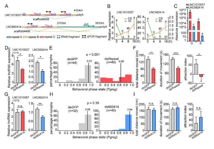為為了驗(yàn)證LNC1010057和LNC992414在蝗蟲型變中的功能,進(jìn)行了一系列分子生物學(xué)實(shí)驗(yàn)。首先,克隆了在LNC1010057和LNC992414基因座中鑒定出的長的轉(zhuǎn)錄本。LNC1010057由重復(fù)的A、B和C元素組成,這些元素依次分布并重復(fù)4次,但C元素重復(fù)三次(圖5A)。序列比對證明LNC992414在5’端與LNC1010057共享相似的重復(fù)序列,但是它們是從不同的基因組基因座轉(zhuǎn)錄而來的(圖5A)。盡管LNC992414的定量表達(dá)水平可以通過特異性引物檢測,但LNC1010057的表達(dá)水平為重復(fù)元件的總表達(dá)水平。如預(yù)期的那樣,LNC1010057和LNC992414的表達(dá)模式極為相似。在CS期間,兩種lncRNA的表達(dá)持續(xù)增加,并且在16h幾乎增加了四倍(圖5B)。在IG期間,4h后表達(dá)水平顯著下降,之后保持相對穩(wěn)定(圖5B)。LNC1010057和LNC992414之間的序列結(jié)構(gòu)和表達(dá)模式的相似性表明它們是同源的lncRNA。但是,實(shí)時(shí)qPCR分析表明,在散居型和群居型蝗蟲的大腦中,LNC1010057的表達(dá)水平比LNC992414的表達(dá)水平高約1000倍(圖5C)。其次,為了測試LNC1010057和LNC992414是否參與蝗蟲型變調(diào)節(jié),在通過RNAi抑制蝗蟲大腦中的表達(dá)后進(jìn)行了行為分析。顯著降低LNC1010057的表達(dá)水平(7470對3764610)和LNC992414(1.9vs.1.0)(圖5D)后行為分析表明,群居型蝗蟲其行為顯著改變?yōu)樯⒕訝顟B(tài)(圖5E)。此外,多個(gè)與型有關(guān)的行為參數(shù)發(fā)生了變化??傄苿?dòng)距離(TDM)和總移動(dòng)持續(xù)時(shí)間(TDMV)顯著降低(圖5F),但是,移動(dòng)速度沒有區(qū)別。同時(shí)群居蝗蟲的特定喜好行為顯著下降(58.3對-13.5圖5F)。但LNC992414表達(dá)降低并未引起從群居狀態(tài)到散居狀態(tài)的轉(zhuǎn)變(圖5G和H)。與對照相比,與型相關(guān)的行為參數(shù)(包括運(yùn)動(dòng)和特定物種的優(yōu)選行為)沒有差異(圖5I)。LNC992414的RNAi實(shí)驗(yàn)不會引起行為變化,因此排除了LNC992414調(diào)節(jié)蝗蟲型變的可能性。這些結(jié)果表明是LNC1010057而不是LNC992414潛在地調(diào)節(jié)了蝗蟲的型變。
