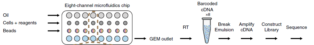 10 X Genomics單細(xì)胞轉(zhuǎn)錄組測序平臺利用微流控、油滴包裹和Barcode標(biāo)記等技術(shù)來實現(xiàn)高通量的細(xì)胞捕獲技術(shù),能夠一次性分離、并標(biāo)記500–10000個單細(xì)胞,從而獲得每個細(xì)胞的3’端的轉(zhuǎn)錄組信息。具有細(xì)胞通量高、建庫成本低、捕獲周期短等優(yōu)勢。該技術(shù)主要用于細(xì)胞分型和標(biāo)記因子的鑒定,從而實現(xiàn)對細(xì)胞群體的劃分與細(xì)胞群體間基因表達(dá)差異的檢測,此外該技術(shù)還可以預(yù)測細(xì)胞分化與研究發(fā)育軌跡,在當(dāng)下疾病、免疫、腫瘤領(lǐng)域以及組織、器官、發(fā)育研究中發(fā)揮越來越重要的作用。