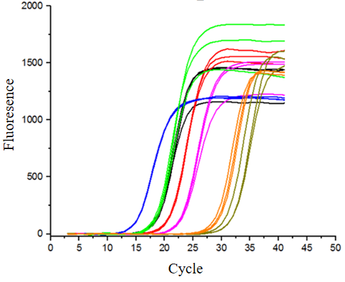 圖4:物種多樣性檢測(cè):分別以不同物種、不同濃度的RNA為模板,進(jìn)行一步法RT-qPCR擴(kuò)增。包括人肝癌(藍(lán)色);果蠅(綠色);小鼠腸道(黑色);番茄果(紅色);日本水稻(紫色);辣椒(橙色);石斑魚(灰色)。