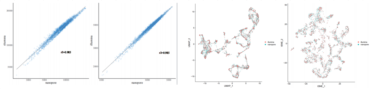 數(shù)據的相似性與準確性進行了展示與介紹,無論是二代與三代數(shù)據的UMI/Gene counts per spot的相關性還是tSEN/U-MAP的降維聚類,都顯示該產品具有非常高的準確性。這充分說明百創(chuàng)S1000全長轉錄組產品完全可以獨立進行數(shù)據的拆分與挖掘分析,無需依賴NGS數(shù)據的校正。