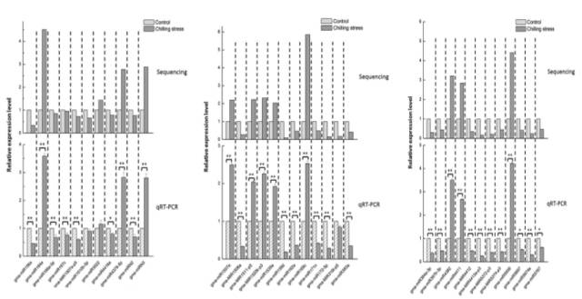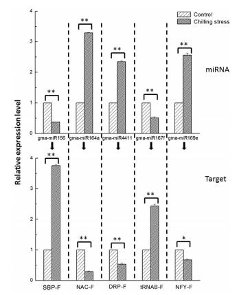 對相應(yīng)靶基因進(jìn)行功能注釋來研究差異表達(dá)的miRNA可能行使的功能。差異表達(dá)的miRNA可以分為四類。第一類包括miRNA家族(miR156、miR164、miR169、miR4412和miR5327),靶基因?yàn)檗D(zhuǎn)錄因子SBP、NAC、NFY、GRAS和bHLH,參與調(diào)控基因表達(dá)和信號(hào)傳導(dǎo)。第二類包括miR4411,其對應(yīng)靶基因涉及抵御疾病。第三類包括miR5761、miR159、miR5667、miR1535、miR511、miR4382和miR4416,其對應(yīng)靶基因參與植物生長發(fā)育中的適應(yīng)性。為了進(jìn)一步確認(rèn)冷脅迫下miRNA和靶基因的關(guān)系,選擇了5個(gè)miRNAs及其靶基因進(jìn)行qRT-PCR驗(yàn)證。結(jié)果表明,在冷脅迫下miRNA-164a,miRNA-4411和miRNA-169e上調(diào)。相反的,他們的靶基因NAC、DRP和NFY顯著下調(diào)。說明miRNA和對應(yīng)靶基因呈負(fù)相關(guān)性。
