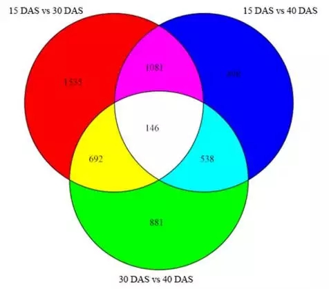 3.為了鑒定在洋蔥球莖膨脹過程中活躍的通路,將得到的unigenes與KEGG數(shù)據(jù)庫中標(biāo)準(zhǔn)參考通路進(jìn)行比對(duì)。15 DAS vs. 30 DAS注釋到了95個(gè)pathway,15 DAS vs. 40 DAS 注釋到了79個(gè)pathway,30 DAS vs. 40 DAS注釋到了86個(gè)pathway。共有6113個(gè)unigenes注釋到了120條KEGG通路中。“淀粉和蔗糖代謝”構(gòu)成了各樣本文庫中的初級(jí)代謝途徑,并有可能在球莖膨大和發(fā)育過程中活性更高。