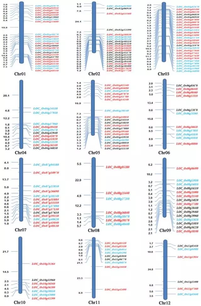 圖3:與育性和雜種優(yōu)勢相關(guān)的基因在染色體上分布。紅色為葉片中的基因,藍(lán)色為花藥中的基因,黑色為子房中的基因。