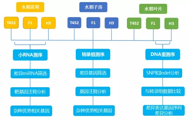 轉(zhuǎn)錄組測序:取T452,H3及雜交F1代的三種不同組織分別進(jìn)行轉(zhuǎn)錄組測序,包括減數(shù)分裂階段的花藥、減數(shù)分裂階段的子房、開花階段的旗葉。每個組織每種品系有3個生物學(xué)重復(fù),共27個樣品。測序平臺為Illumina HiSeq 2500,平均每個樣品測約5G。