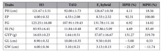 表一:T452與H3雜交F1代的雜種優(yōu)勢。HPH:高親優(yōu)勢;MPH中親優(yōu)勢;PH:植株高度;EP:單株谷粒數(shù);FG:單花谷粒數(shù);SS:結(jié)實率;GYP:單株產(chǎn)量;GL:10谷粒長度;GW:10谷粒寬度。