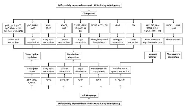 為了進(jìn)一步揭示circRNA在果實成熟中的作用,我們對circRNA靶向的miRNA以及miRNA的靶標(biāo)mRNA進(jìn)行了預(yù)測。結(jié)果發(fā)現(xiàn)其中20個circRNA上含有7個miRNA結(jié)合位點,同時鑒定出94個miRNA的靶標(biāo)mRNA。通過對鑒定到的94個靶標(biāo)mRNA進(jìn)行GO富集和KEGG分析,總結(jié)出circRNA可能通過調(diào)節(jié)代謝過程、激素平衡以及光合相關(guān)的通路來調(diào)控番茄果實成熟。此外,circRNA還可能通過參與轉(zhuǎn)錄調(diào)控,主要是通過調(diào)節(jié)包括ERF、SBP、MYB等果實成熟相關(guān)的轉(zhuǎn)錄因子,來調(diào)節(jié)番茄果實的成熟。