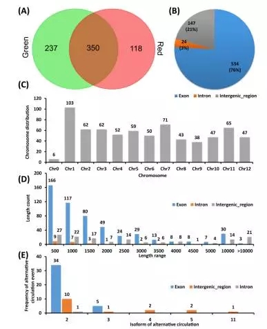(A):共表達(dá)和特異表達(dá)分析;(B):來源分析;(C):染色體分布分析;(D):長度分析;(E):可變剪切分析。