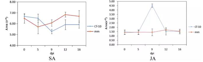 3)如圖3所示, Ontario 792中,SA含量剛開(kāi)始緩慢下降,然后緩慢上升直到16 dpi。Moneymaker中,SA含量在5 dpi下降至最低水平,然后逐漸增加直到12 dpi。Ontario 792中,從5 ~ 9 dpi JA含量迅速上升到峰值,然后從9到12dpi下降到原始水平,但Moneymaker中始終保持相對(duì)穩(wěn)定,表明JA可能參與激活對(duì)C. fulvum的防御系統(tǒng)。