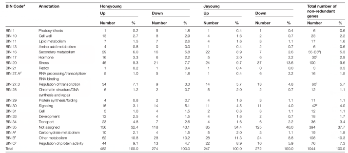 Hongyoung 、 Jayoung和Hongyoung 和 Jayoung共1044個差異基因;Hongyoung 和 Atlantic 中有 756 個差異基因,其中482 個基因上調(diào),274 個基因下調(diào)。Jayoung 和 Atlantic 中有519 個差異基因,其中有248個上調(diào)基因,273個下調(diào)基因。根據(jù)其注釋功能將其分為20組(主要BIN),分為未知注釋轉(zhuǎn)錄本(37.7%),蛋白質(zhì)活性調(diào)控(10.3%),應(yīng)激(9.6%) ,其他代謝(7.3%),轉(zhuǎn)錄調(diào)控因子(5.7%),次級代謝(5.3%)和信號傳導(dǎo)(4.0%)。
