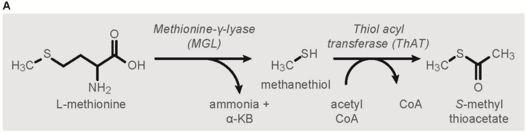 圖3 A)S-methyl thioesters生物合成過(guò)程和B)CmThAT 1定位結(jié)果