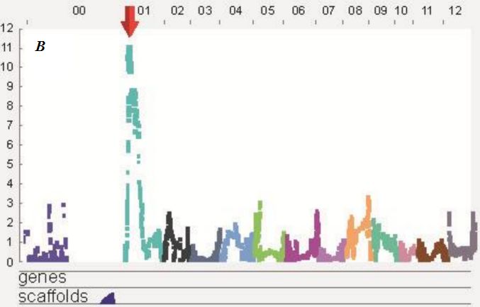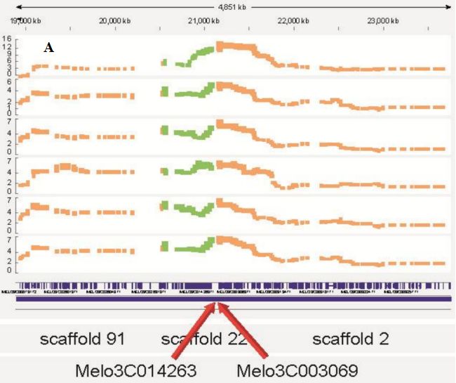 每個(gè)樣品產(chǎn)生5-15M的100bp序列,與參考基因組比對(duì)獲得82140個(gè)SNP,甜瓜基因組預(yù)測(cè)有27427個(gè)基因,本研究共有16000個(gè)基因表達(dá)。以SNP為基礎(chǔ)劃bin,所有個(gè)體共檢測(cè)到6636個(gè)重組事件,產(chǎn)生3663個(gè)bin(圖1A),bin的平均長(zhǎng)度為72.6kb。遺傳圖譜構(gòu)建總圖距為2047cM,利用該圖譜進(jìn)行對(duì)之前未能掛載染色體的scffold進(jìn)行掛載,并對(duì)部分組裝錯(cuò)誤進(jìn)行了糾正(圖1B中圓圈)。