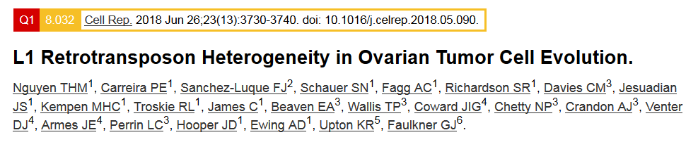 Nguyen THM, Carreira PE, Sanchez-Luque FJL, et al. Retrotransposon Heterogeneity in Ovarian Tumor Cell Evolution.Cell Rep.2018 Jun 26.