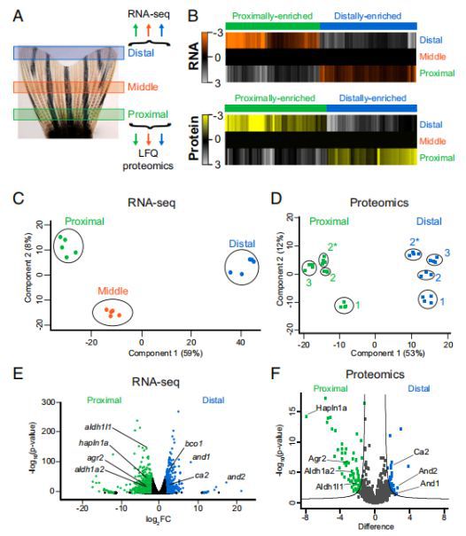 ????????為了鑒定可能參與尾鰭位置記憶的候選分子,本研究對(duì)未受傷的斑馬魚尾鰭的近端,中間和遠(yuǎn)端區(qū)域進(jìn)行了RNA測序(RNA-seq)和無標(biāo)記定量(LFQ)蛋白質(zhì)組學(xué)(圖1A),共鑒定出566個(gè)轉(zhuǎn)錄本和238個(gè)蛋白質(zhì),主要存在于近或遠(yuǎn)的富集梯度中(圖1B)。另外,主成分分析(PCA)顯示鰭的近端和遠(yuǎn)端區(qū)域之間的轉(zhuǎn)錄物(圖1C)和蛋白質(zhì)(圖1D)豐度的變化很大。中間區(qū)域的轉(zhuǎn)錄本聚集成一個(gè)獨(dú)特的組,但更接近于遠(yuǎn)端區(qū)域(圖1C)。差異豐富分子的最大差異發(fā)生在近端和遠(yuǎn)端區(qū)域之間,包括1,424個(gè)轉(zhuǎn)錄本和113個(gè)蛋白質(zhì)(圖1E)。因此,基因組的表達(dá)在整個(gè)尾鰭的近遠(yuǎn)端軸上存在著定量的差異。