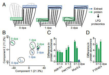 為了檢驗(yàn)這種預(yù)測,分別于截肢后1、3天(dpa),在blastema形成期和生長期(圖4A)對(duì)再生鰭的片段進(jìn)行LFQ蛋白質(zhì)組學(xué)研究。為了減少魚類之間的潛在變異,作者從同一條魚中采集了再生鰭的背側(cè)和腹遠(yuǎn)端區(qū)域(雙截肢)。作者發(fā)現(xiàn)3061種蛋白質(zhì)中有97種、11種和2種在0,1和3dpa的背側(cè)和腹側(cè)-遠(yuǎn)側(cè)位置之間差異表達(dá)。在再生過程中不同時(shí)間蛋白質(zhì)表達(dá)的PCA顯示1和3dpa的樣品聚集成不同的組,在近端或遠(yuǎn)端區(qū)域之間幾乎沒有變化,而在未損傷的鰭(0dpa)中近端和遠(yuǎn)端區(qū)域之間存在更多變異(圖4B)。然而,在1dpa差異表達(dá)的11種蛋白中,6種在未受損魚鰭(0dpa)中也差異表達(dá)。編碼這些蛋白質(zhì)的三個(gè)基因aldh1l1,hsd17b7和muc5.2(圖4C)也通過RNA-seq測量發(fā)現(xiàn)在未受傷的鰭片中差異表達(dá)。UniProt ID F1R4E4的一種無特征蛋白質(zhì),是唯一在0,1和3dpa差異表達(dá)的蛋白質(zhì)(圖4D)。