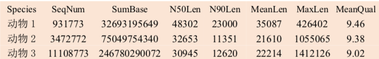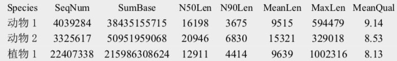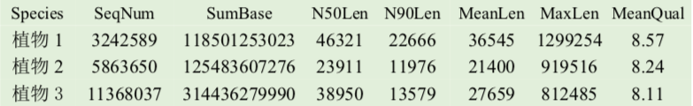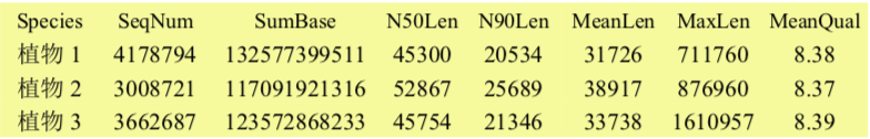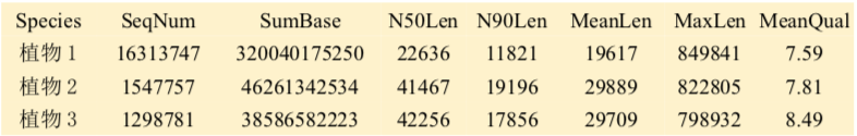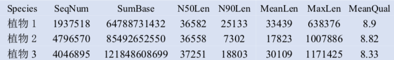注:Species:分析的物種信息;SeqNum:各個長度范圍內(nèi)序列的數(shù)目;SumBase:指各個長度范圍內(nèi)序列的總長度;N50Len:reads N50長度;N90Len:readsN90長度;MeanLen:平均reads長度;MaxLen:最長reads長度;MeanQual:質(zhì)量值,準確度=1-10^(-Q/10)