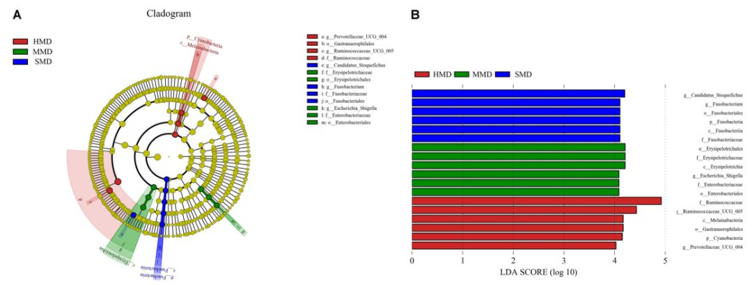 LefSe分析表明(圖7),在屬的水平上,MMD組與HMD和SMD組之間顯著性差異較大的菌種為埃希氏菌?–?志賀氏菌。埃希氏菌屬?–?志賀氏菌是常見的病原體,其主要的傳播途徑包括:受感染對象的糞便、食物和含有細菌的水。該病原體可引起結(jié)腸粘膜炎癥,導(dǎo)致腹痛、腹瀉和形成粘膜糞便等癥狀。因此,用于喂養(yǎng)麝的食物和水以及糞便管理是減輕輕度腹瀉的關(guān)鍵。另外,SMD組與HMD和MMD組之間顯著性差異較大的菌種為梭桿菌。梭桿菌是炎癥性微生物,它可抑制體內(nèi)T細胞應(yīng)答并促進炎性因子的表達。比較MMD組和SMD組,可以推測Fusobacterium可能在輕度腹瀉的背景下增殖并成為主要病原體。因此,森林麝的腸道生理紊亂與其主要病原體的類型是存在一定的相關(guān)性的。