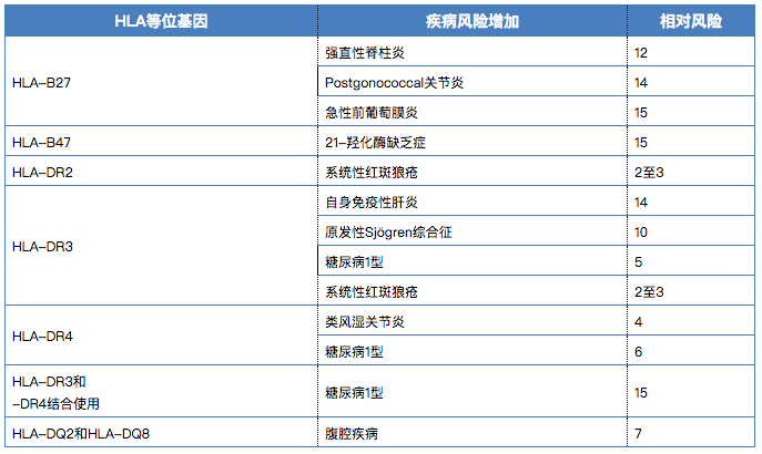 1972年Russel報(bào)告銀屑病(牛皮癬)患者攜帶HLA-B13或HLA-B17。此后陸續(xù)發(fā)現(xiàn)大量其它疾病與特定的HLA相關(guān),其中,HLA-B27抗原見于大約90%的強(qiáng)直性脊椎炎病人,由此HLA-B27在臨床檢測中作為強(qiáng)直性脊柱炎的標(biāo)志物,以至使HLA分型具有了診斷價(jià)值,甚至,能較早地證實(shí)疾病亞型之間的臨床區(qū)別,例如,尋常銀屑病與HLA相關(guān),而膿皰性銀屑病則不然;青少年性胰島素依賴型糖尿病與HLA-B8、HLA-Bw15和HLA-B18相關(guān),而晚期發(fā)作型糖尿病并無這種相關(guān)性。因此,特定類型的HLA便成為某些疾病的遺傳標(biāo)志。在疾病研究的延伸面,是關(guān)于HLA與長壽的關(guān)系,目前亦形成一個(gè)新的研究熱點(diǎn)。目前研究比較清楚的幾個(gè)HLA與自身免疫疾病相關(guān)關(guān)系如下表: