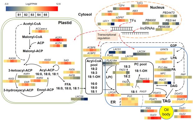 圖5.風箏果種子中參與蓖麻油酸和甘油三酯合成的潛在基因網(wǎng)絡(luò)