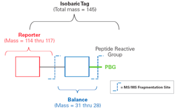 技術原理:iTRAQ標記試劑由三部分組成,報告基團、質量平衡基團和肽反應部分,(1)報告基團:有八種,相對分子質量分別為113、114、115、116、117、118、119和121,因此iTRAQ可同時標記8組樣品;(2)平衡部分:相對分子質量分別為32、31、30、29、28、27、26和24,形成相對分子質量均為145的等量異位標簽,保證iTRAQ標記的同一肽段的質荷比相同;(3)肽反應部分:能與肽N端及賴氨酸側鏈發(fā)生共價連接而標記上肽段,幾乎可以標記所有蛋白質。?